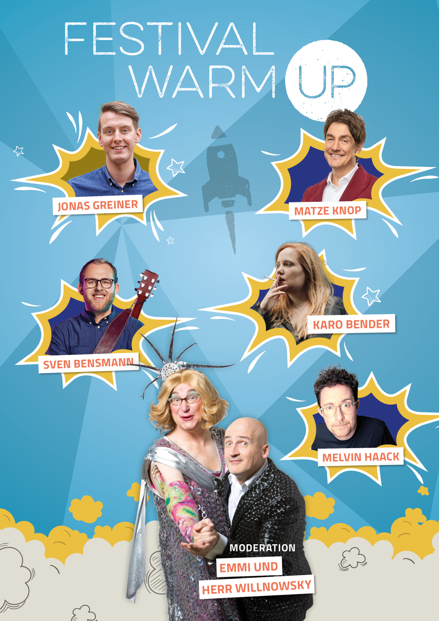 Bevor es richtig losgeht, muss man sich aufwärmen, das weiß jeder Sportler, sonst zerrt man sich die Muskeln, und das wollen wir ja nicht. In diesem Falle müssen die Lachmuskeln aufgewärmt werden, was nebenbei bemerkt auch etwas für Sportmuffel ist. Die diesjährige Aufwärmeinheit wird von Emmi & Willnowsky moderiert, welche mit ihrer ganz eigenen Herzlichkeit durchs Programm führen werden.